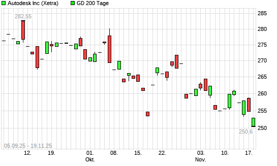 Mit dem Rücksetzer auf 250,70 EUR hat die Autodesk-Aktie am 18.11.2025 die 200-Tage-Linie nach unten gekreuzt.