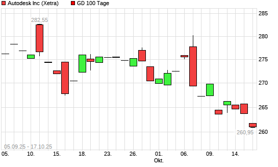 Mit dem Rücksetzer auf 261,20 EUR hat die Autodesk-Aktie am 16.10.2025 die 100-Tage-Linie nach unten gekreuzt.Die Autodesk-Aktie befindet sich seit dem 29.08.2025 im langfristigen Abwärtstrend ...weiterlesen