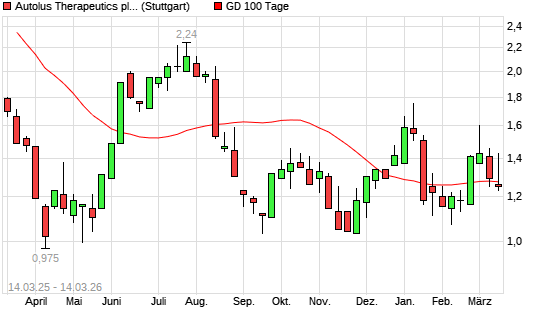 Mit dem Rücksetzer auf 1,25 EUR hat die Autolus Therapeutics Plc-Aktie am 13.03.2026 die 100-Tage-Linie nach unten gekreuzt.