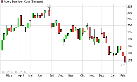 Mit dem Rücksetzer auf 175,00 EUR hat die Avery Dennison-Aktie (ISIN US0536111091) am 05.02.2025 ein neues 12-Monats-Tief erreicht und damit den Kurs vom 03.02.2025 eingestellt.