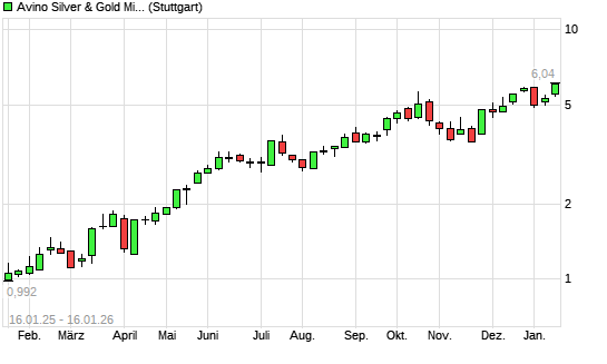 Mit dem Anstieg auf 5,86 EUR hat die Avino Silver & Gold Mines-Aktie (ISIN CA0539061030) am 15.01.2026 ein neues All-Time-High erreicht und damit den Kurs vom 30.12.2025 eingestellt.