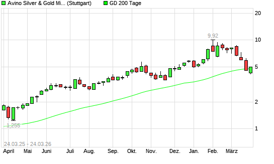 Mit dem Anstieg auf 4,99 EUR hat die Avino Silver & Gold Mines-Aktie am 23.03.2026 die 200-Tage-Linie nach oben gekreuzt.