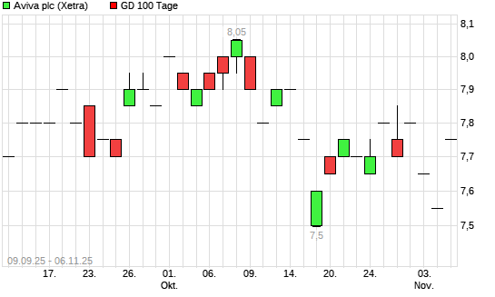 Mit dem Anstieg auf 7,70 EUR hat die Aviva-Aktie am 05.11.2025 die 100-Tage-Linie nach oben gekreuzt.