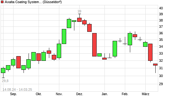 Mit dem Rücksetzer auf 30,80 EUR hat die Axalta Coating Systems-Aktie (ISIN BMG0750C1082) am 13.03.2025 ein neues 6-Monats-Tief erreicht und damit den Kurs vom 12.03.2025 eingestellt.