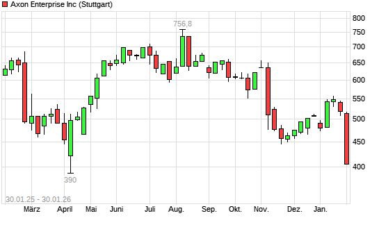 Mit dem Rücksetzer auf 428,70 EUR hat die Axon Enterprise-Aktie (ISIN US05464C1018) am 29.01.2026 ein neues 12-Monats-Tief erreicht und damit den Kurs vom 25.11.2025 eingestellt.