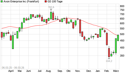 Mit dem Rücksetzer auf 483,40 EUR hat die Axon Enterprise-Aktie am 05.03.2026 die 100-Tage-Linie nach unten gekreuzt.