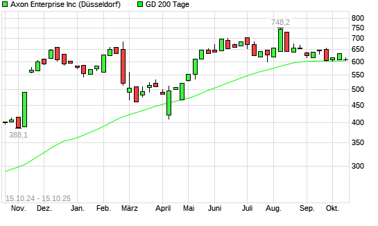 Mit dem Rücksetzer auf 600,80 EUR hat die Axon Enterprise-Aktie am 14.10.2025 die 200-Tage-Linie nach unten gekreuzt.