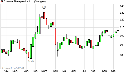 Mit dem Anstieg auf 109,90 EUR hat die Axsome Therapeutics-Aktie (ISIN US05464T1043) am 16.10.2025 ein neues 6-Monats-Hoch erreicht und damit den Kurs vom 09.09.2025 eingestellt.