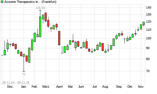 Mit dem Anstieg auf 119,65 EUR hat die Axsome Therapeutics-Aktie (ISIN US05464T1043) am 07.11.2025 ein neues 6-Monats-Hoch erreicht und damit den Kurs vom 28.10.2025 eingestellt.