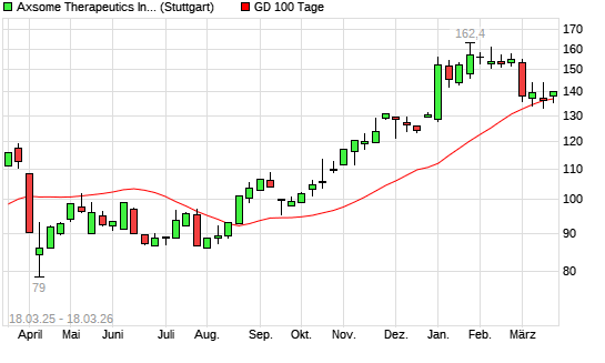 Mit dem Rücksetzer auf 136,80 EUR hat die Axsome Therapeutics-Aktie am 17.03.2026 die 100-Tage-Linie nach unten gekreuzt.