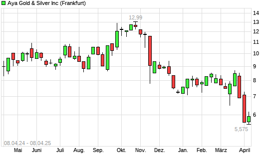 Mit dem Rücksetzer auf 5,61 EUR hat die Aya Gold & Silver-Aktie (ISIN CA05466C1095) am 07.04.2025 ein neues 12-Monats-Tief erreicht und damit den Kurs vom 04.04.2025 eingestellt.