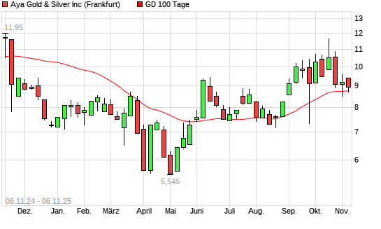 Mit dem Rücksetzer auf 8,74 EUR hat die Aya Gold & Silver-Aktie am 05.11.2025 die 100-Tage-Linie nach unten gekreuzt.