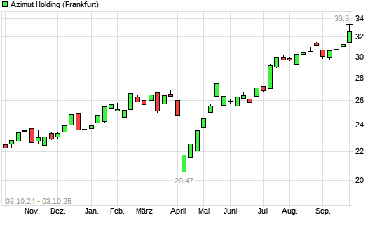 Mit dem Anstieg auf 33,30 EUR hat die Azimut Holding-Aktie (ISIN IT0003261697) am 02.10.2025 ein neues 10-Jahres-Hoch erreicht und damit den Kurs vom 30.09.2025 eingestellt.