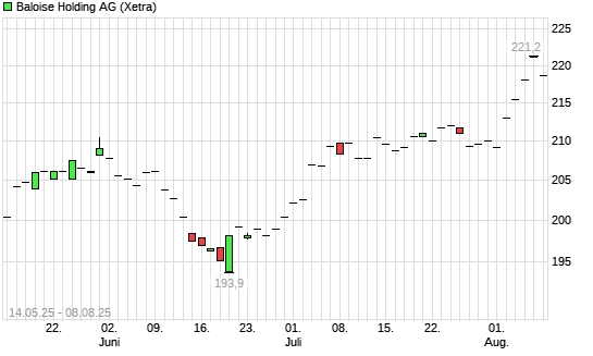 Mit dem Anstieg auf 219,00 EUR hat die Bâloise-Holding-Aktie (ISIN CH0012410517) am 07.08.2025 ein neues All-Time-High erreicht und damit den Kurs vom 06.08.2025 eingestellt.