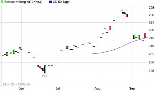 Mit dem Anstieg auf 216,00 EUR hat die Bâloise-Holding-Aktie am 10.09.2025 die 50-Tage-Linie nach oben gekreuzt.
