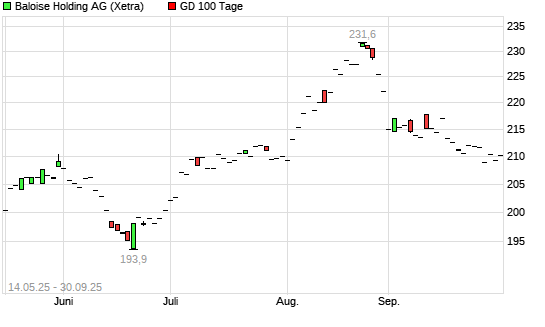 Mit dem Rücksetzer auf 208,00 EUR hat die Bâloise-Holding-Aktie am 29.09.2025 die 100-Tage-Linie nach unten gekreuzt.