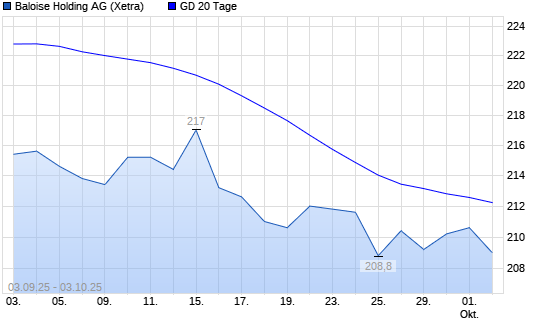 Mit dem Rücksetzer auf 210,40 EUR hat die Bâloise-Holding-Aktie am 02.10.2025 die 20-Tage-Linie nach unten gekreuzt.