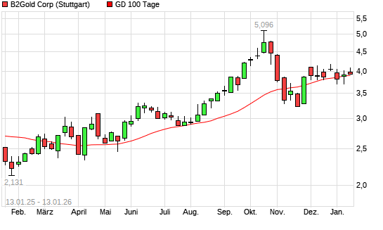 Mit dem Anstieg auf 4,08 EUR hat die B2Gold-Aktie am 12.01.2026 die 100-Tage-Linie nach oben gekreuzt.