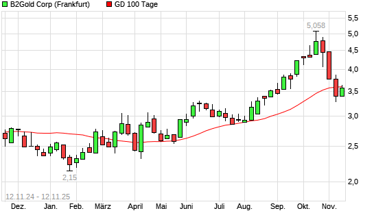 Mit dem Rücksetzer auf 3,53 EUR hat die B2Gold-Aktie am 11.11.2025 die 100-Tage-Linie nach unten gekreuzt.