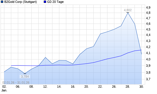 Mit dem Rücksetzer auf 4,15 EUR hat die B2Gold-Aktie am 30.01.2026 die 20-Tage-Linie nach unten gekreuzt.