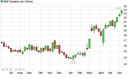 Mit dem Anstieg auf 23,80 EUR hat die BAE Systems-Aktie (ISIN GB0002634946) am 04.06.2025 ein neues All-Time-High erreicht und damit den Kurs vom 03.06.2025 eingestellt.