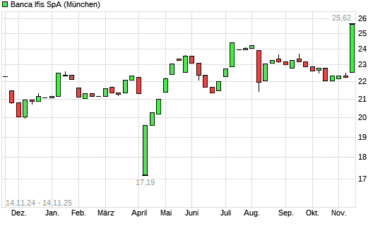 Mit dem Anstieg auf 25,18 EUR hat die BANCA IFIS S.P.A.-Aktie (ISIN IT0003188064) am 13.11.2025 ein neues 5-Jahres-Hoch erreicht und damit den Kurs vom 12.11.2025 eingestellt.