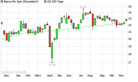 Mit dem Anstieg auf 22,68 EUR hat die BANCA IFIS S.P.A.-Aktie am 10.11.2025 die 200-Tage-Linie nach oben gekreuzt.