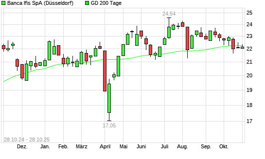 Mit dem Rücksetzer auf 22,06 EUR hat die BANCA IFIS S.P.A.-Aktie am 27.10.2025 die 200-Tage-Linie nach unten gekreuzt.