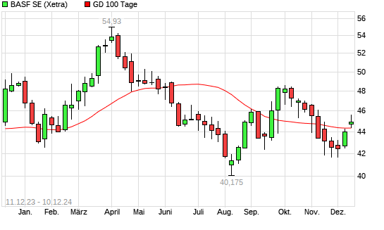 Mit dem Anstieg auf 45,23 EUR hat die BASF-Aktie am 09.12.2024 die 100-Tage-Linie nach oben gekreuzt.