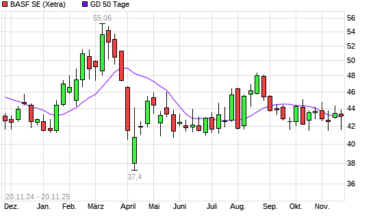 Mit dem Anstieg auf 43,20 EUR hat die BASF-Aktie am 19.11.2025 die 50-Tage-Linie nach oben gekreuzt.