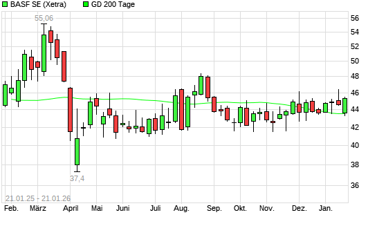 Mit dem Rücksetzer auf 43,56 EUR hat die BASF-Aktie am 20.01.2026 die 200-Tage-Linie nach unten gekreuzt.