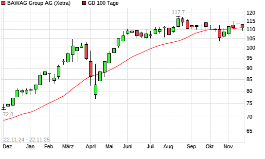 Mit dem Rücksetzer auf 110,60 EUR hat die BAWAG Group-Aktie am 21.11.2025 die 100-Tage-Linie nach unten gekreuzt.