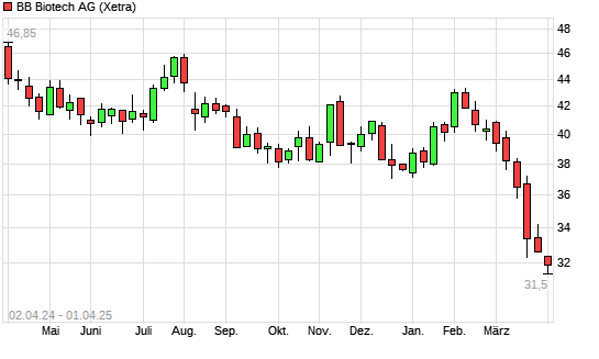 Mit dem Rücksetzer auf 31,65 EUR hat die BB Biotech-Aktie (ISIN CH0038389992) am 31.03.2025 ein neues 10-Jahres-Tief erreicht und damit den Kurs vom 28.03.2025 eingestellt.