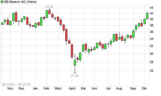 Mit dem Anstieg auf 41,70 EUR hat die BB Biotech-Aktie (ISIN CH0038389992) am 07.10.2025 ein neues 6-Monats-Hoch erreicht und damit den Kurs vom 06.10.2025 eingestellt.