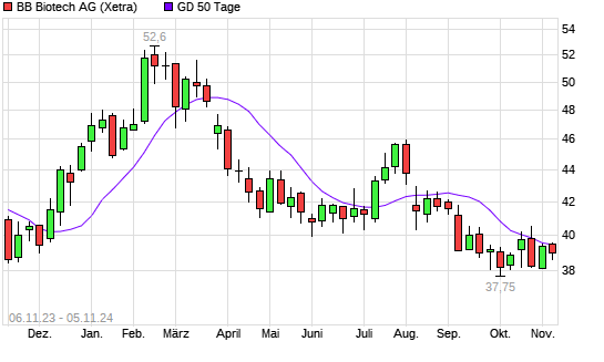 Mit dem Rücksetzer auf 38,70 EUR hat die BB Biotech-Aktie am 04.11.2024 die 50-Tage-Linie nach unten gekreuzt.