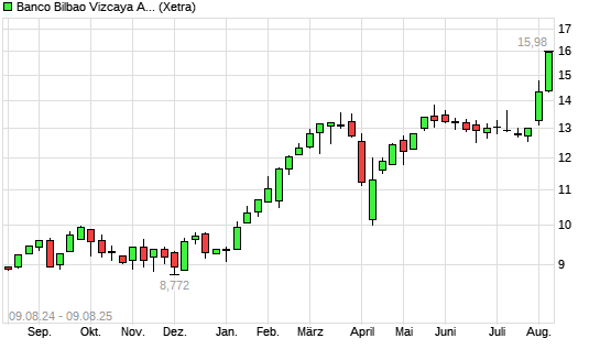 Mit dem Anstieg auf 16,16 EUR hat die BBVA-Aktie (ISIN ES0113211835) am 08.08.2025 ein neues All-Time-High erreicht und damit den Kurs vom 07.08.2025 eingestellt.