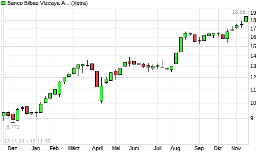 Mit dem Anstieg auf 18,76 EUR hat die BBVA-Aktie (ISIN ES0113211835) am 11.11.2025 ein neues All-Time-High erreicht und damit den Kurs vom 10.11.2025 eingestellt.