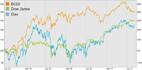 Durch die massive defensive Stärke der zehn BCDI-Champions fallen die Korrekturen des BCDI im Vergleich zu Dax und Dow Jones wesentlich schwächer und kürzer aus. Aus diesem Grund erzielt der BCDI seit der Börsenpremiere eine massive Outperformance gegenüber den großen Aktienindizes.