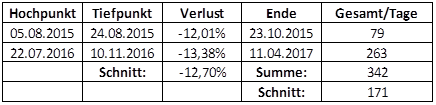 Beim BCDI gab es seit dem Börsenstart am 1. Juli 2014 zwei Zeiträume, in denen das Barometer um mehr als 10% korrigierte (im Schnitt: -12,7%). Ausgehend vom vorangegangenen Hochpunkt dauerte es durchschnittlich 171 Tage, bis die Kursverluste wieder wettgemacht wurden. Die Schwächephasen erstreckten sich insgesamt über einen Zeitraum von 342 Tagen.Zum Vergleich hier der Dow Jones: