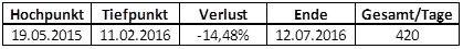Der Dow Jones verzeichnet seit dem 1. Juli 2014 zwar nur einen Rücksetzer von über 10%. Doch in dieser Phase wurde ein im Vergleich zum BCDI höherer Verlust von 14,5% verzeichnet (BCDI im Schnitt: -12,7%), und die Konsolidierung dauerte 420 Tage an (BCDI insgesamt: 342 Tage, durchschnittlich: 171 Tage).Und hier die Rücksetzer des Dax: