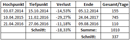 Beim Dax gab es im selben Zeitraum drei Kursrücksetzer von mehr als 10% (im Schnitt: -18,3%). Die Schwächephasen dauerten insgesamt 1010 Tage, beziehungsweise im Mittel 337 Tage. Das Ergebnis: