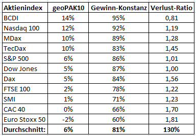 Die Höhe der Verlust-Ratio wird durch die Anzahl der Verluste und durch die durchschnittliche Verlusthöhe bestimmt. Das bedeutet, je geringer die Verlust-Ratio ausfällt, desto niedriger ist das Anlagerisiko. Als einziger Index erreicht der BCDI hier einen Wert von weniger als eins (0,81). Beim gemessen an der geoPAK10 und der Gewinn-Konstanz Zweitplatzierten, dem Nasdaq 100, beträgt die Verlust-Ratio bspw. 1,19. Das Korrekturrisiko des US-Index fällt also 47% höher aus als beim BCDI. Fazit: