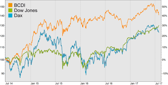 BCDI-Ergebnis 2017: +3,4% GewinnDer Monatsschlusskurs von 140,84 Punkten bedeutet einen BCDI-Kursgewinn von 3,4% seit Jahresanfang. Im selben Zeitraum verzeichnet der Dax einen Gewinn von 5,6%, und beim Dow Jones steht ein Plus von 10,8% zu Buche. Mittelfristig fällt der Vergleich weiterhin klar zugunsten des BCDI aus. Konkret: