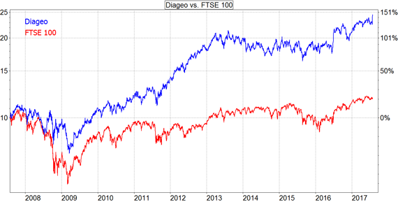 Der britische Leitindex FTSE 100, in dem Diageo gelistet ist, liegt zwar vom Anlagerisiko her (Verlust-Ratio: 1,22) gleichauf mit Diageo. Doch dafür fällt die Gewinn-Konstanz (78%) deutlich geringer aus, und Aktionäre mussten sich mit einer mageren Kursrendite von im Mittel nur 2% pro Jahr seit 2007 (Gesamt-Performance: +15,9%) zufriedengeben.