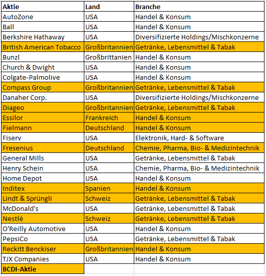 Abschließend die Übersicht aller 25 Defensiv-Champions, bei der die zehn BCDI-Aktien orange hinterlegt sind (Stand: 31. Juli 2017):
