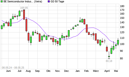 Mit dem Rücksetzer auf 98,50 EUR hat die BE Semiconductor-Aktie am 07.05.2025 die 50-Tage-Linie nach unten gekreuzt.