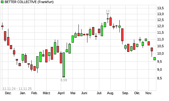 Mit dem Rücksetzer auf 9,59 EUR hat die BETTER COLLECTIVE-Aktie (ISIN DK0060952240) am 10.11.2025 ein neues 6-Monats-Tief erreicht und damit den Kurs vom 06.11.2025 eingestellt.