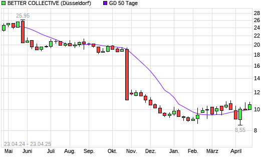 Mit dem Rücksetzer auf 10,02 EUR hat die BETTER COLLECTIVE-Aktie am 22.04.2025 die 50-Tage-Linie nach unten gekreuzt.