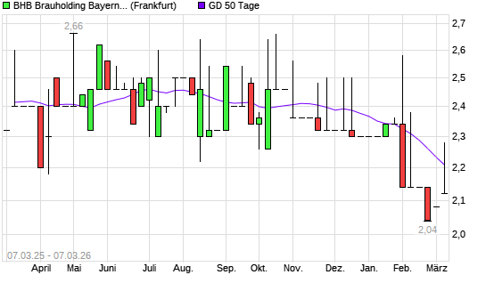 Mit dem Rücksetzer auf 2,12 EUR hat die BHB BRAUHLD.BAY.MIT.AG-Aktie am 06.03.2026 die 50-Tage-Linie nach unten gekreuzt.Die BHB BRAUHLD.BAY.MIT.AG-Aktie befindet sich seit ...weiterlesen