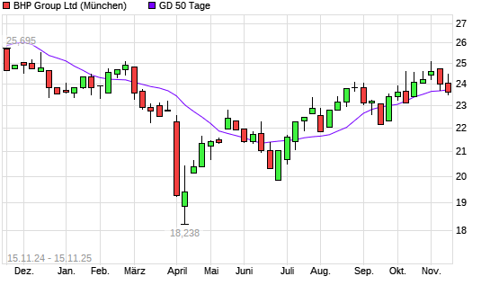 Mit dem Rücksetzer auf 23,60 EUR hat die BHP Group-Aktie am 14.11.2025 die 50-Tage-Linie nach unten gekreuzt.Die BHP Group-Aktie befindet sich seit dem 23.09.2025 im langfristigen Aufwärtstrend ...weiterlesen